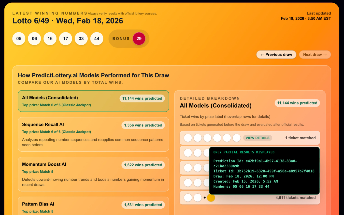 Our Sequence Recall (LookBack: 17 draws) model generated this exact combination — a full 6/6 match.
